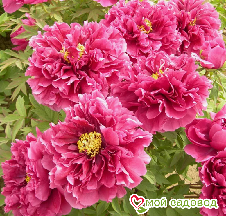 Один из лучших красных сортов пионов. Цветки полумахровые диаметром 20-25 см. Окраска цветка яркая розово-красная, центр жёлтый. Лепестки блестящие, гофрированные. Верхняя часть лепестков в процессе цветения становится красновато-фиолетовой. Куст высотой 120-150 см. Побеги сильные, вертикальные. Аромат лёгкий, пряный. Цветение обильное с мая по июнь. На одном кусте может быть от 30 до 70 цветков. Пион древовидный — морозоустойчивый кустарник, достигающий высоты до 2 м, с крупными ярко-зелеными листьями. На одном кусте может быть от 30 до 70 цветков. Диаметр каждого от 20 до 25 см. Продолжительность цветения 12—14 дней. Растение декоративно и после цветения из-за необычной формы листьев. Пион неприхотлив, устойчив к болезням. На одном месте без пересадки может расти более 20 лет. Место посадки Для посадки пионов понадобится защищенное от ветров место с хорошей освещенностью. Сорта светлой окраски, а также пионы с простыми и полумахровыми цветками можно посадить на частично затеняемом участке, это продлит цветение и защитит цветы от выгорания. ХРАНЕНИЕ ДО ПОСАДКИ: После получения посылки, рекомендуем вскрыть пакет и осмотреть корневище. Почки должны быть плотные и розового цвета. Так же уделите внимание самому корневищу, все сомнительные, потемневшие, сморщенные части удалите, а места среза обработайте зеленкой или залой. Если почки еще не тронулись в рост, а высаживать в открытый почву рано, советуем Вам хранить корневище в холодильнике, обязательно оставляя его в пакете с торфяной смесью или в коробке под снегом. Если почки успели раскрыться это не критично, сохранить до посадки их так же возможно, высадите корень пиона в большой просторный горшок или в любую другую ёмкость.